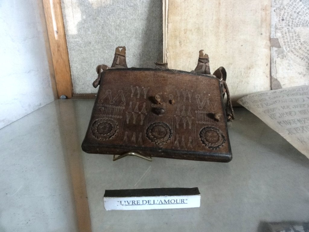 Le musée de Foumban n’est pas seulement rempli de fusils de guerre, lances empoissonnées et autres armes. Il y a également des objets pour la protection, comme ces masques avec têtes d’oiseau, que l’on mettait au dessus des toits pour chasser les mauvais esprits. Il y a aussi ce luth, instrument de musique joué pour les malades, la tenue de Mangweloune, la danseuse du roi Njoya Ibrahim. Lui, le roi Njoya Ibrahim, a marqué l’histoire du peuple Bamoun par de nombreuses inventions. Njoya crée des épaulettes pour l’armée, le calendrier des récoltes. En 1896, il invente l’alphabet Shü mom (encre du peuple Bamoun) en 510 signes, réduits quelques années plus tard en 80 syllabes. Avec cette écriture, le roi Njoya écrit des livres sur la médecine traditionnelle. Certains ont déjà été traduits en français.